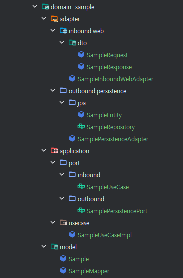 헥사고날 아키텍처 기반의 패키지 구조로 패키지 및 Sample 클래스를 작성