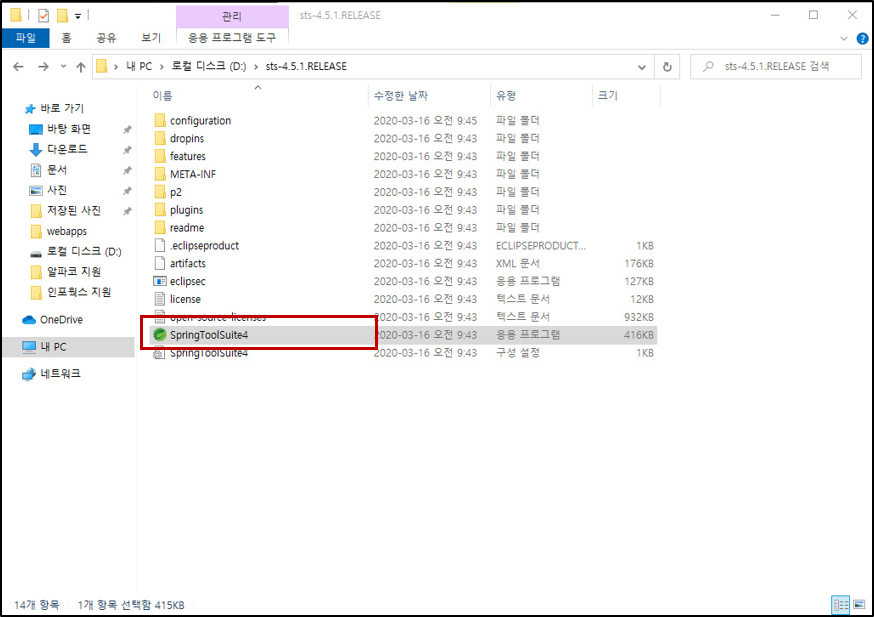 다운 받으면 jar파일 하나를 다운 받게 되는데, (spring-tool-suite-4-4.5.1.RELEASE-e4.14.0-win32.win32.x86_64.self-extracting)