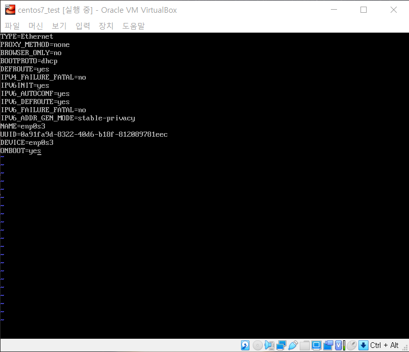 vi /etc/sysconfig/network-scripts/ifcfg-{네트워크 인터페이스 이름, enp0s3} 입력