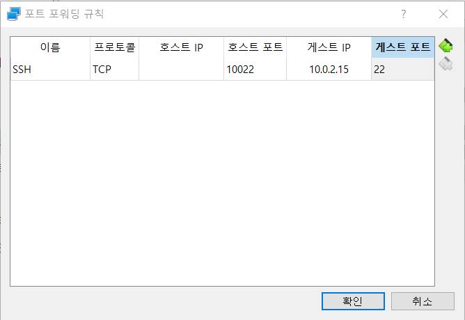 Virtual Box [설정] - [네트워크] - [고급] - [포트포워딩]