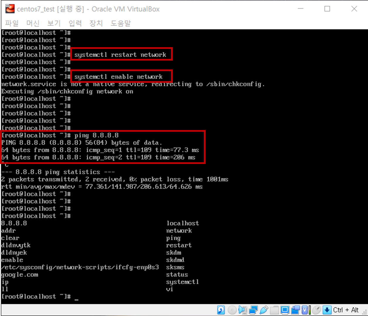 ping 8.8.8.8 (외부에 ping을 날림으로서 외부로의 네트워크가 연결이 되었는 지 확인)