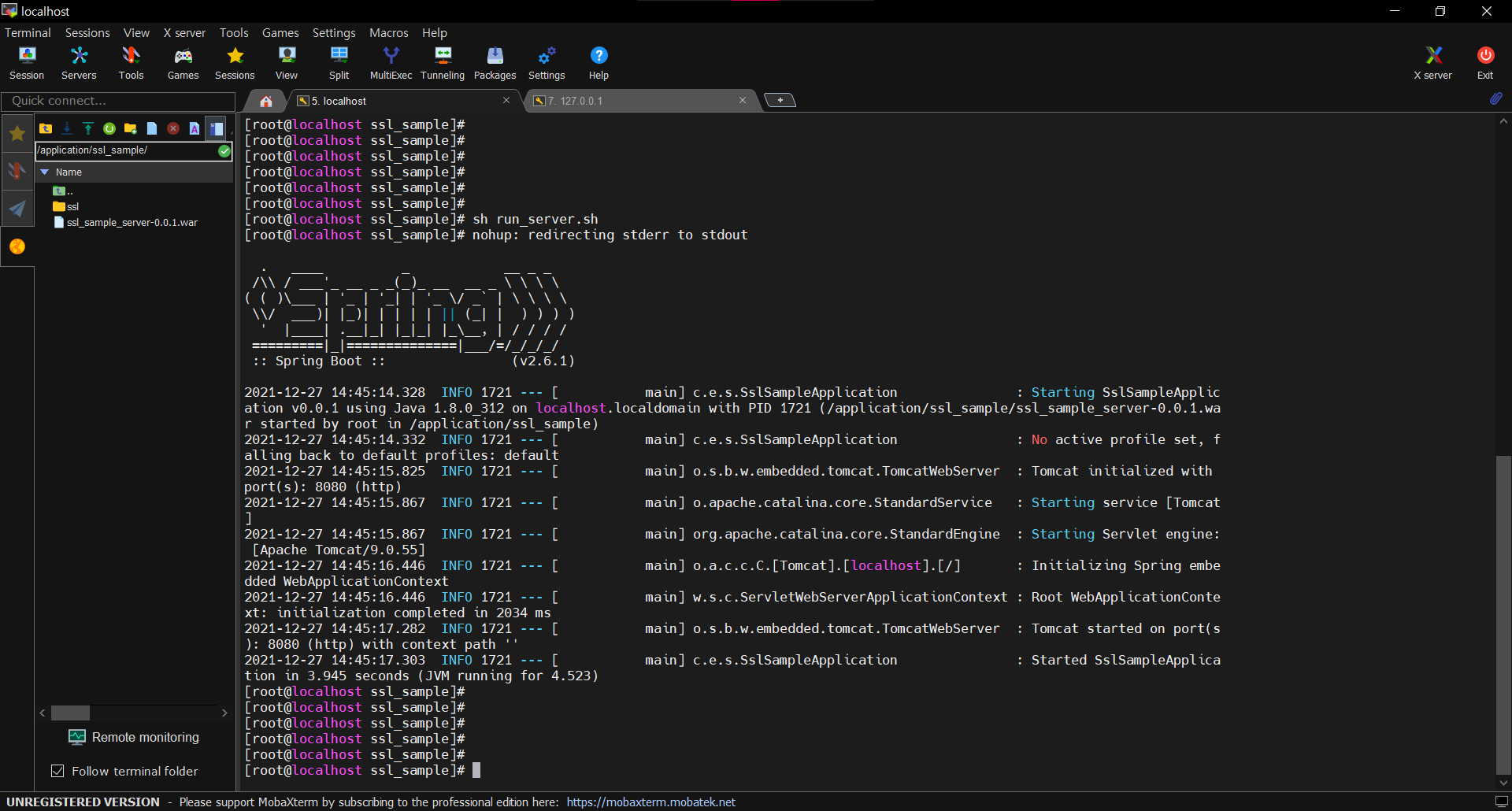 생성된 war파일을 리눅스 서버 /application/ssl_sample 경로에 업로드 (mobaXterm이 파일 업로드 기능을 가지고 있음)