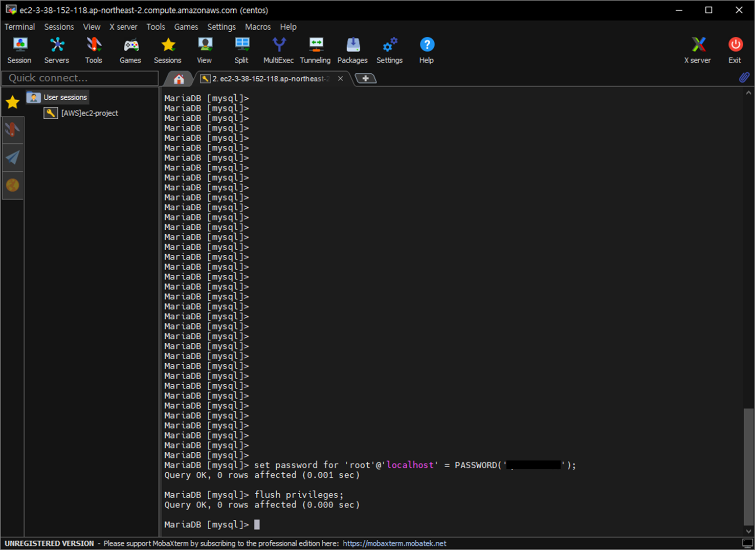 명령어3 =====> set password for 'root'@'localhost' = PASSWORD('{비밀번호}');