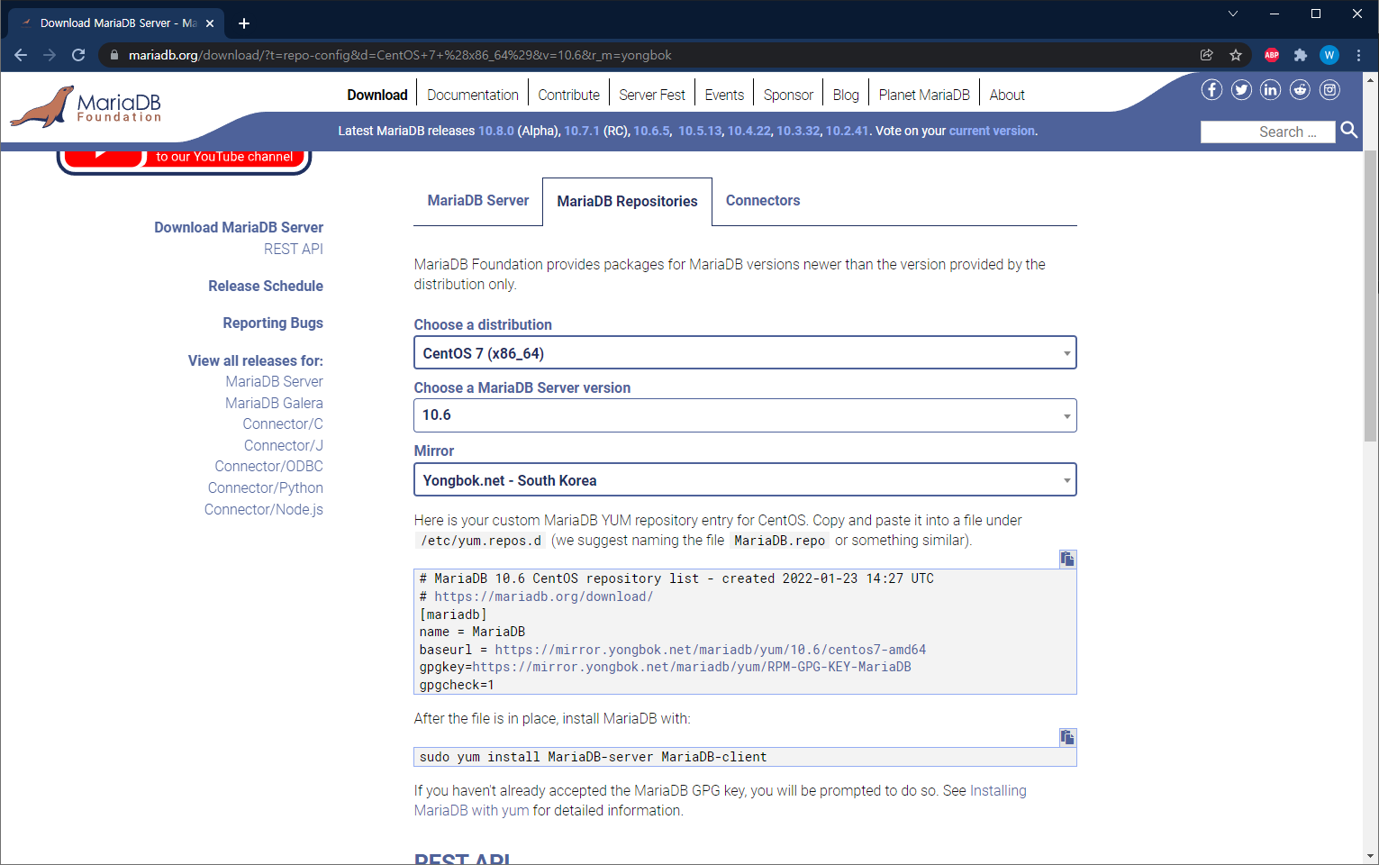 2. 아래 사이트에서 os 버전 및 MariaDB 설치할 버전을 선택하면 Repository 정보와 설치 명령어를 설명해줌