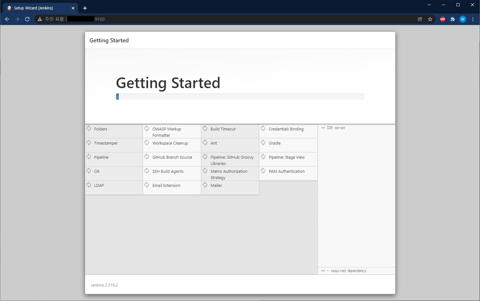 9. Install suggested plugins 클릭 하면 기본 플러그인으로 설치 진행됨