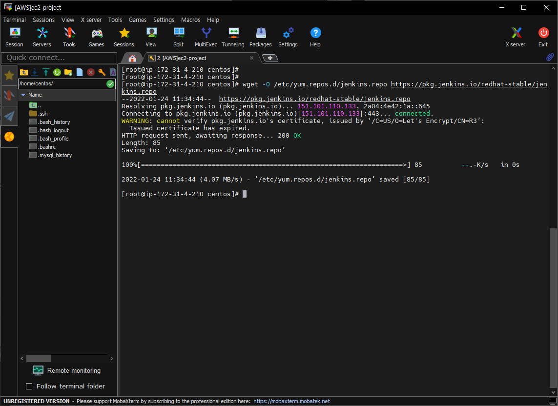 ##만약 wget 명령어 사용 시 아래와 같은 문구가 나오면 다음 명령어 입력ERROR: cannot verify pkg.jenkins.io's certificate, issued by ‘/C=US/O=Let's Encrypt/CN=R3’: