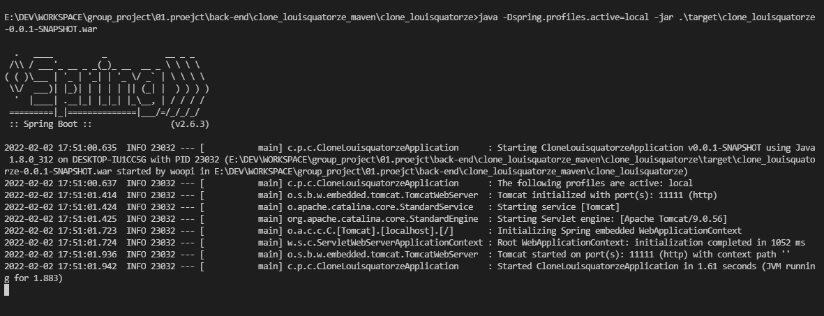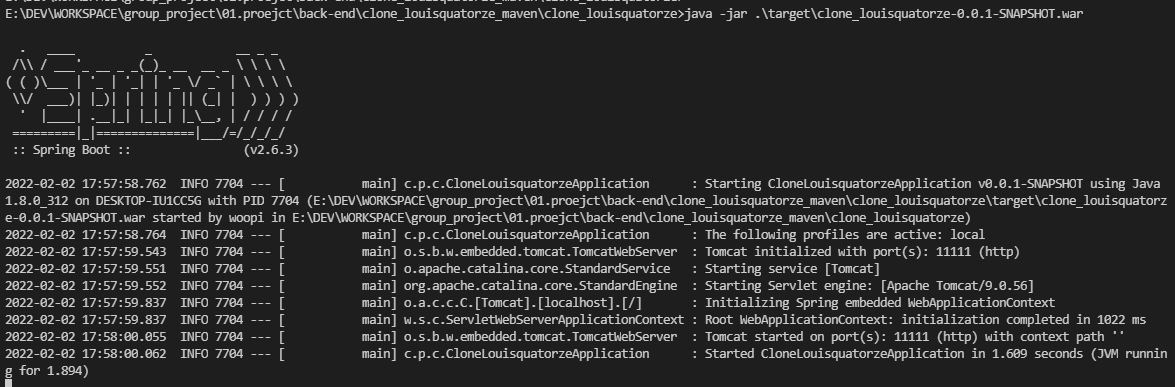 ##확인해보면 기동 로그 중간에 The following profiles are active: local 이라고 되어 있는 것을 확인 할 수 있고, 바로 밑 줄에 port번호가 local에 설정한 11111인 것이 확인된다.
