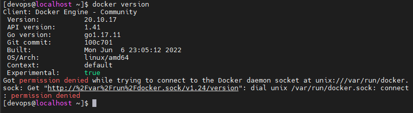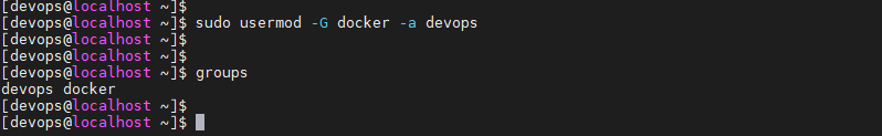 sudo usermod -G docker -a devops 명령어 입력 후 재로그인