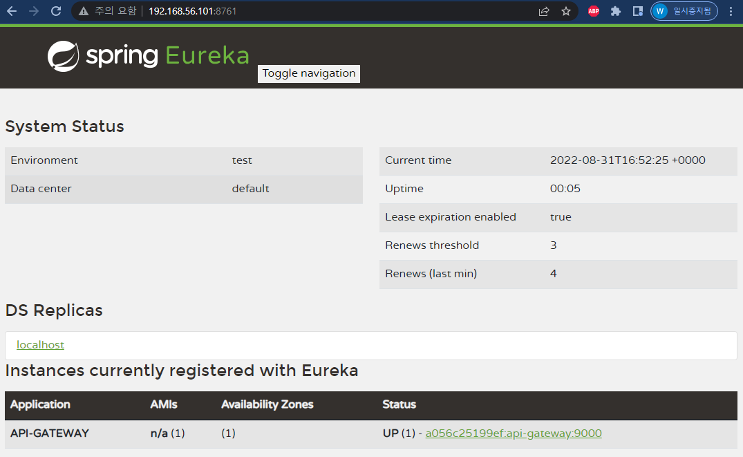 호스트 OS에서 브라우저를 띄워 VM에서 띄우고 있는 Eureka-Discovery-Server로 접속 해본다