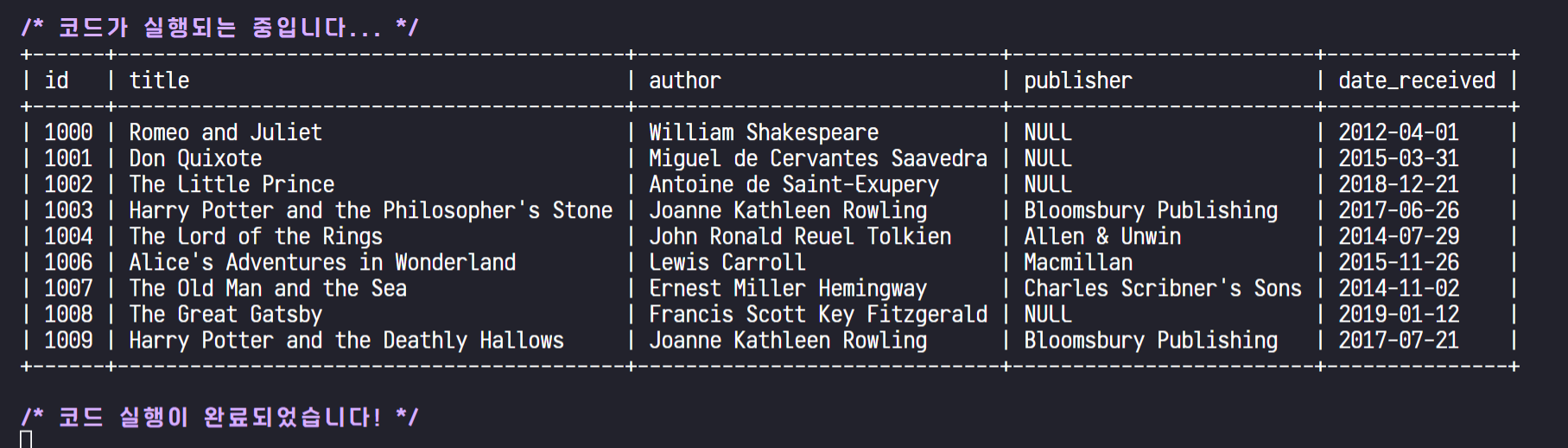 1. 테이블 검색에 있어서 가장 중요한 3가지 명령어 SELECT {조회할 컬럼, *를 쓰면 모든 컬럼 조회} FROM {조회할 테이블} WHERE {조건} 2. DISTINCT 뒤에 나오는 컬럼의 중복을 제거하고 보여준다. DISTINCT 뒤에 2개 이상의 컬럼을 적으면, 한쪽 컬럼에 중복이 있어도, 다른 쪽 컬럼의 값이 다르면 다르게 취급한다. 3. 실습 - SELECT1 3-1 . 지시사항 book의 정보를 검색하기 위해 오른쪽 코드 창에 다음과 같이 입력해 보세요. SELECT * FROM book; 3-2. TIPS ;(세미콜론)은 한 문장의 끝을 의미합니다. 명령어를 입력한 후 마지막에 ;을 입력해야 컴퓨터가 명령어를 구분할 수 있습니다. 3-3. SQL 입력 -- SELECT문을 이용해 bo..